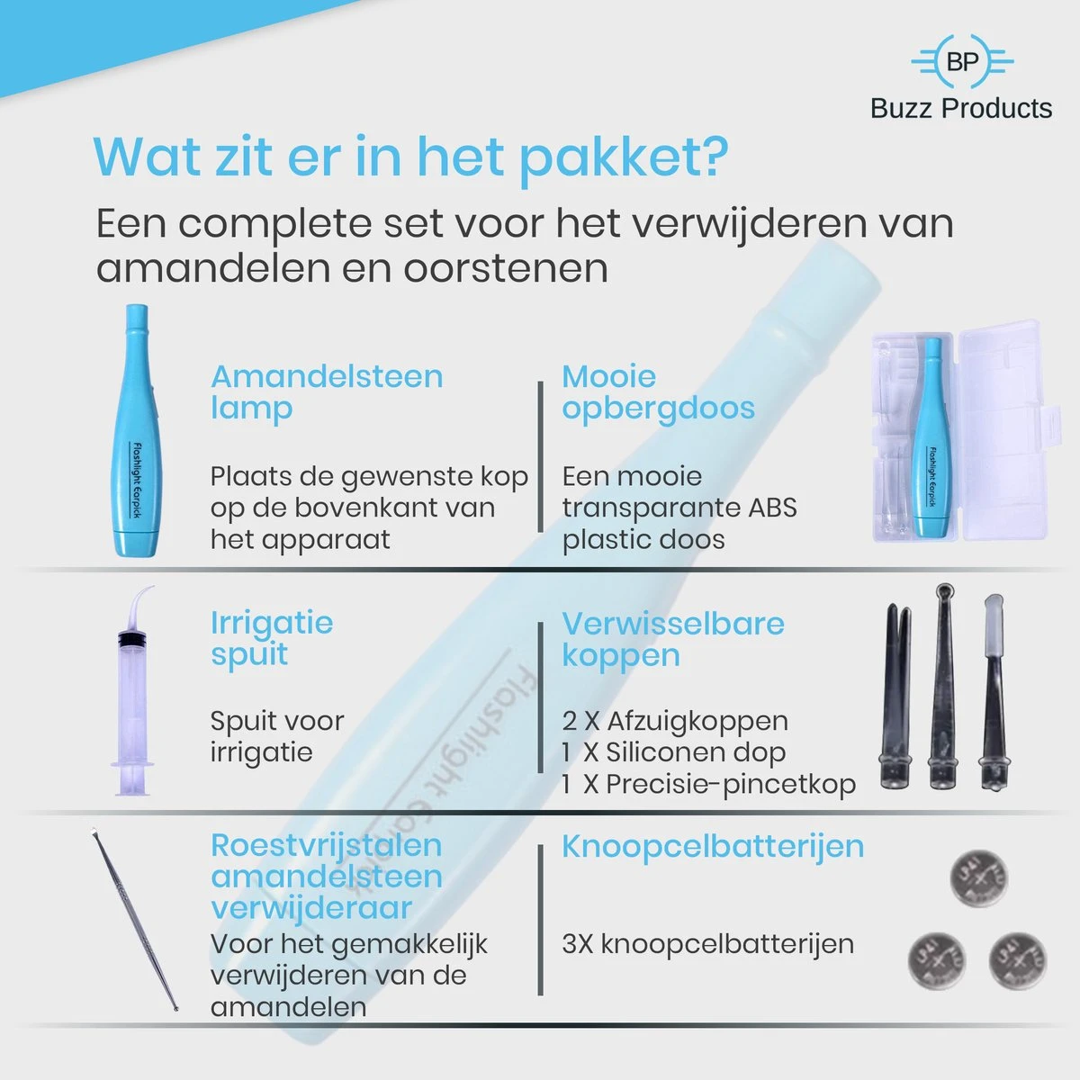 Heeft u last van harde gele stukjes in uw keel bij uw amandelen, en hoest u deze soms op? U kunt ze ook eerder zelf verwijderen, nog vóórdat ze erg beginnen te stinken en hard worden! Deze set bevat alles wat u nodig heeft: een waterspuit om de holtes uit te spuiten, een lepeltje om stukjes weg te halen, en een compact lampje met handige opzetstukjes om in uw keel te schijnen.