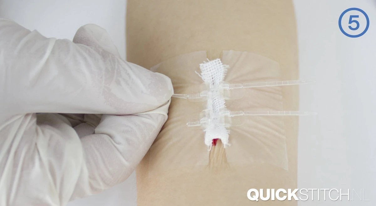 De QuickStitch pleister is speciaal ontworpen voor het sluiten van acute wonden zoals snijwonden en chirurgische incisies. Het is een nieuwe niet-invasieve techniek die weefseltrauma kan verminderen, het comfort van de patiënt verbetert en veroorzaakt mogelijk minder littekens na genezing.